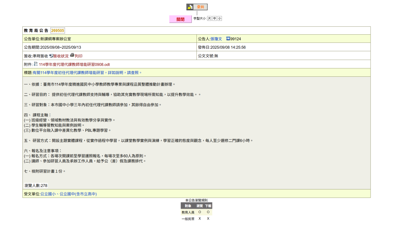 依教育局公告 269505 轉知有關 114 學年度初任代理代課教師增能研習,詳如說明