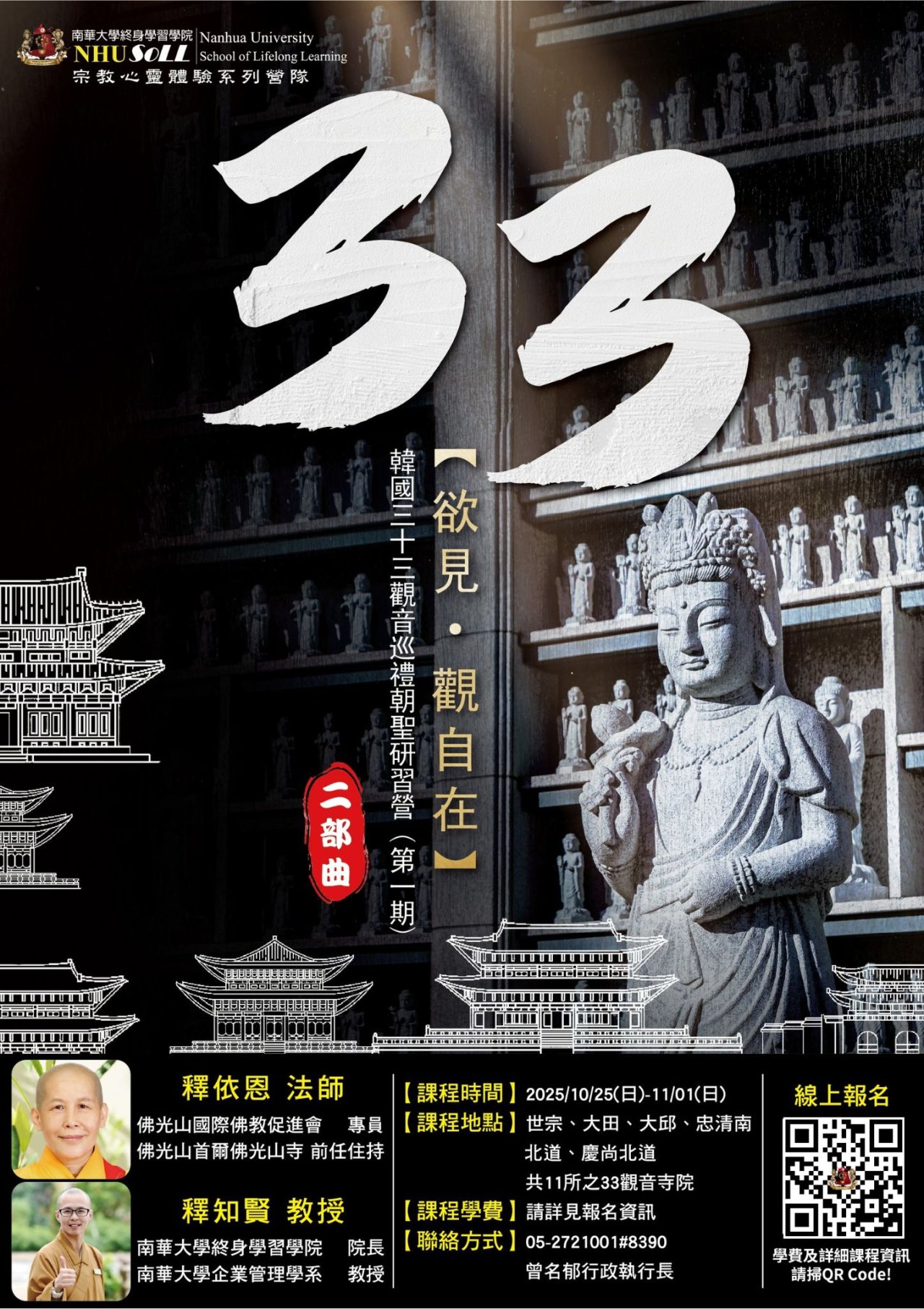 轉知南華大學(南華終院字第 11407011702 號函)114 年 10 月份開辦之【欲見‧觀自在】韓國三十三觀音巡禮朝聖研習營(第一期):二部曲課程資訊