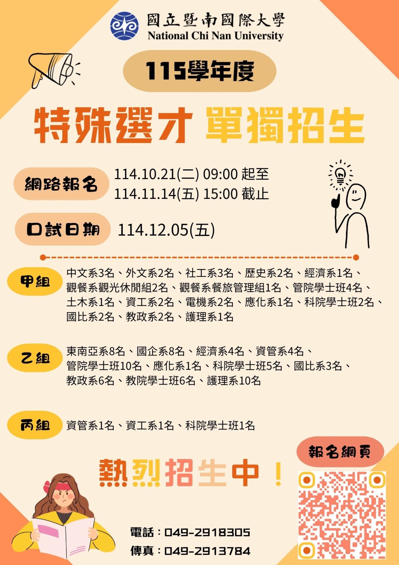 一 115 學年度特殊選才單獨招生網路報名自 114 年 10 月 21 日起至 114 年 11 月 14 日止。