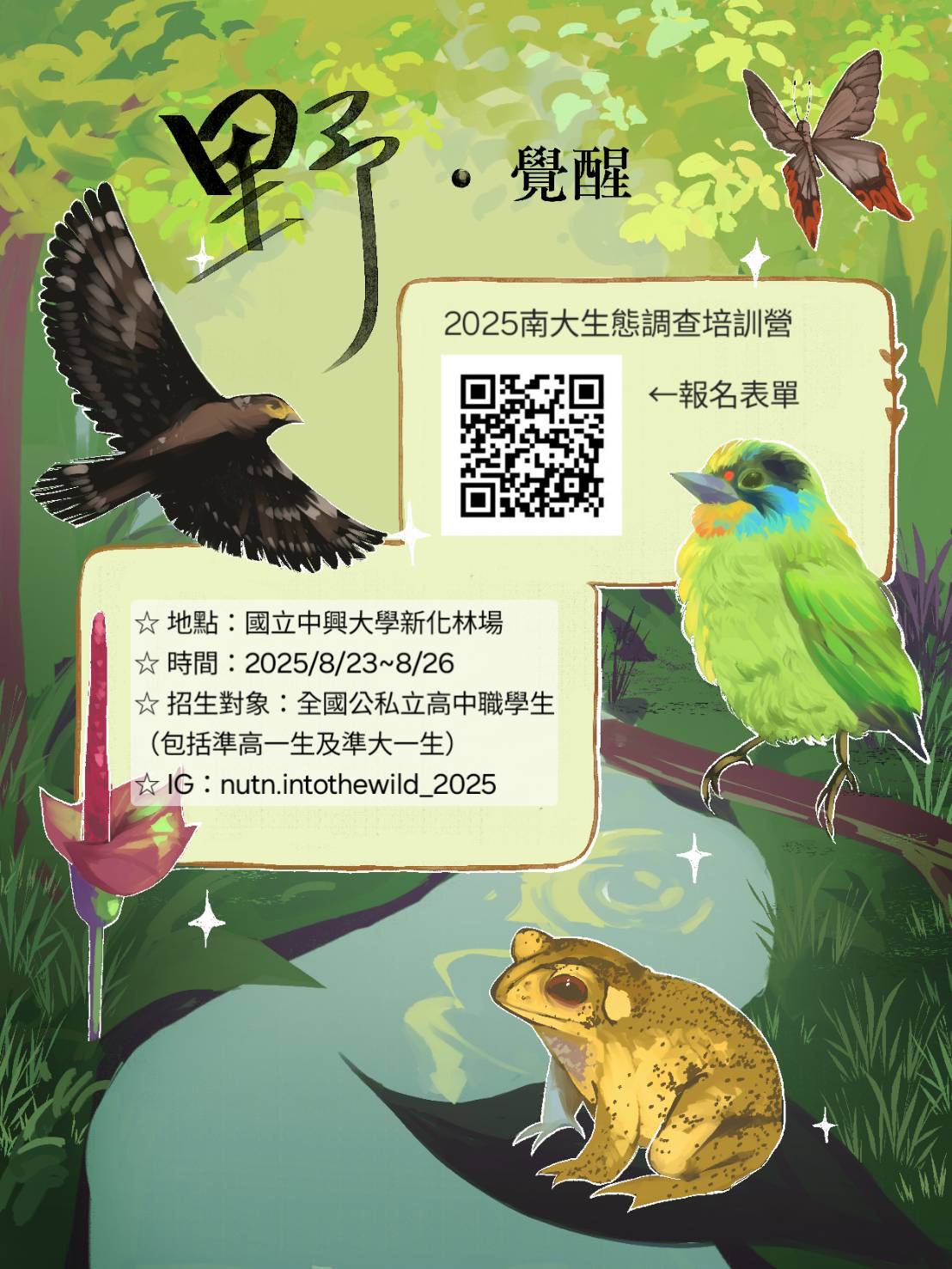 (五)活動詳細資訊請參考「野•覺醒生態調查培訓營」海報與議程表(如附件)。公務電子信箱: nutneco.frog@gmail.com 。