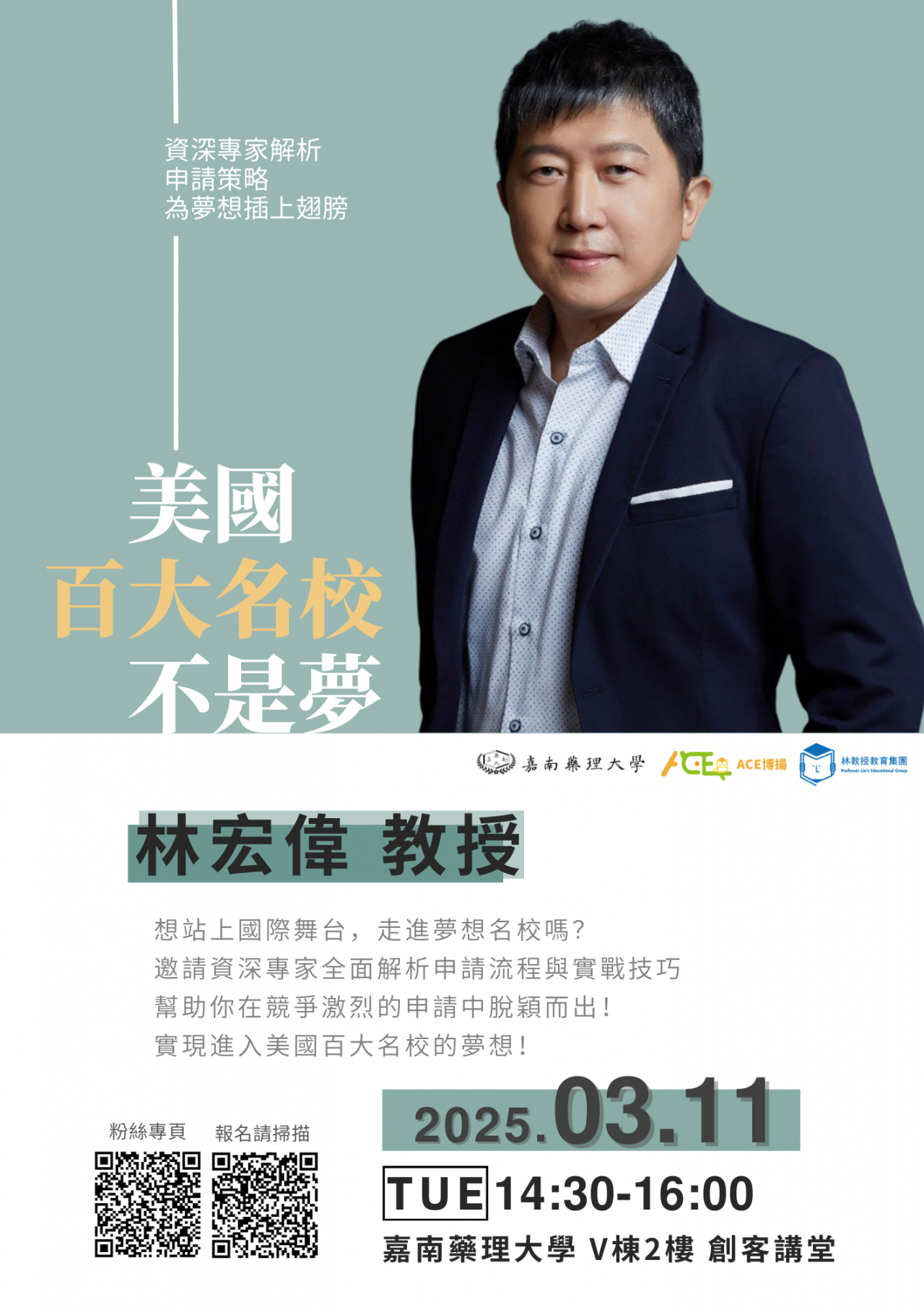 主旨:檢送本校訂於 114 年 3 月 11 日辦理「專題演講-美國百大名校不是夢」演講海報 1 份,請查照並協助轉知宣導。