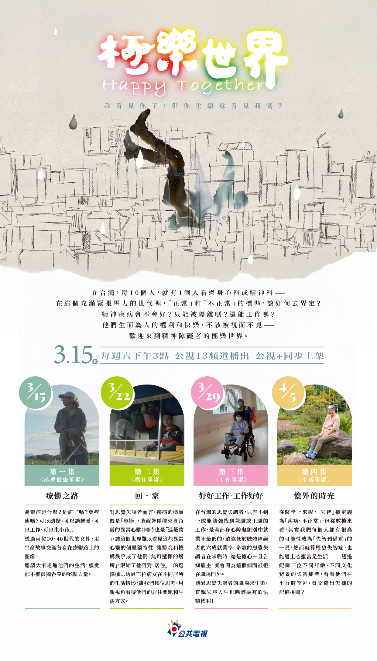 二、節目將在三月十五日至四月五日,每週六下午三點播出,邀請收看精神障礙主題:「療鬱之路-鬱症者如何在生活中追尋自我」、「回家-思覺失調者對居住的多元想像」、「好好工作工作好好-思覺失調者的職場求生術」、「憶外的時光-失智症平行時空的記憶拼圖」,懇請協助轉知節目資訊,並協助張貼節目海報及播出訊息。