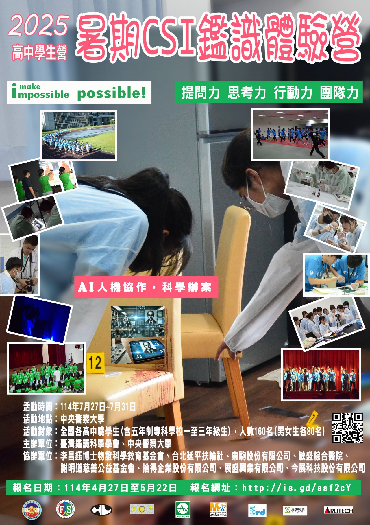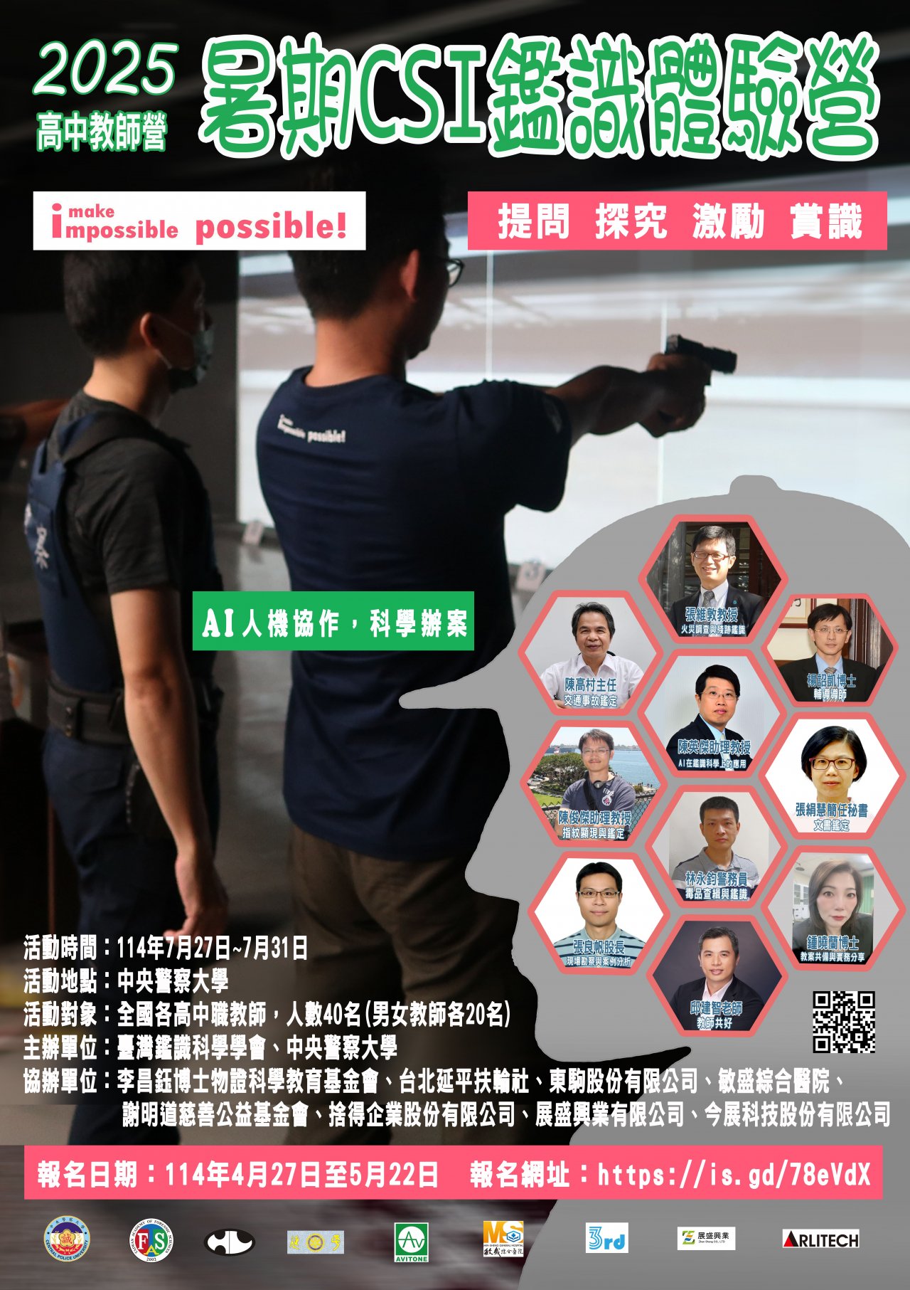 本營隊活動招收高中教師 40 位學員(女生 20 位,男生 20 位),高中學生 160 位學員(女生 80 名,男生 80 名)。報名簡章及海報請參閱附件或至活動網站 https://www.facebook.com/TAFS.CSI/ 下載