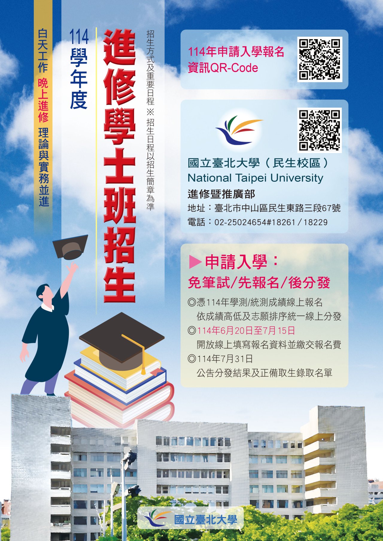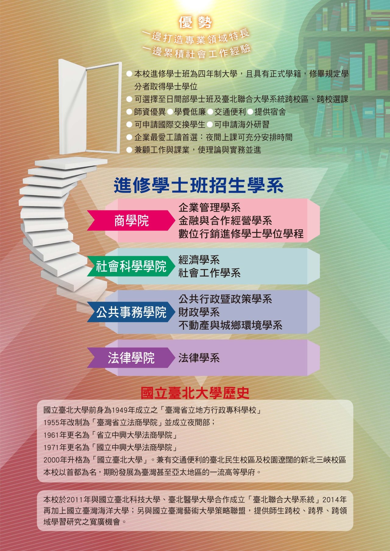 (四)社會科學學院:經濟學系、社會工作學系。四、本校今年網路報名相關資訊及連結請參閱: https://new.ntpu.edu.tw/eec/bachelor-continuing
