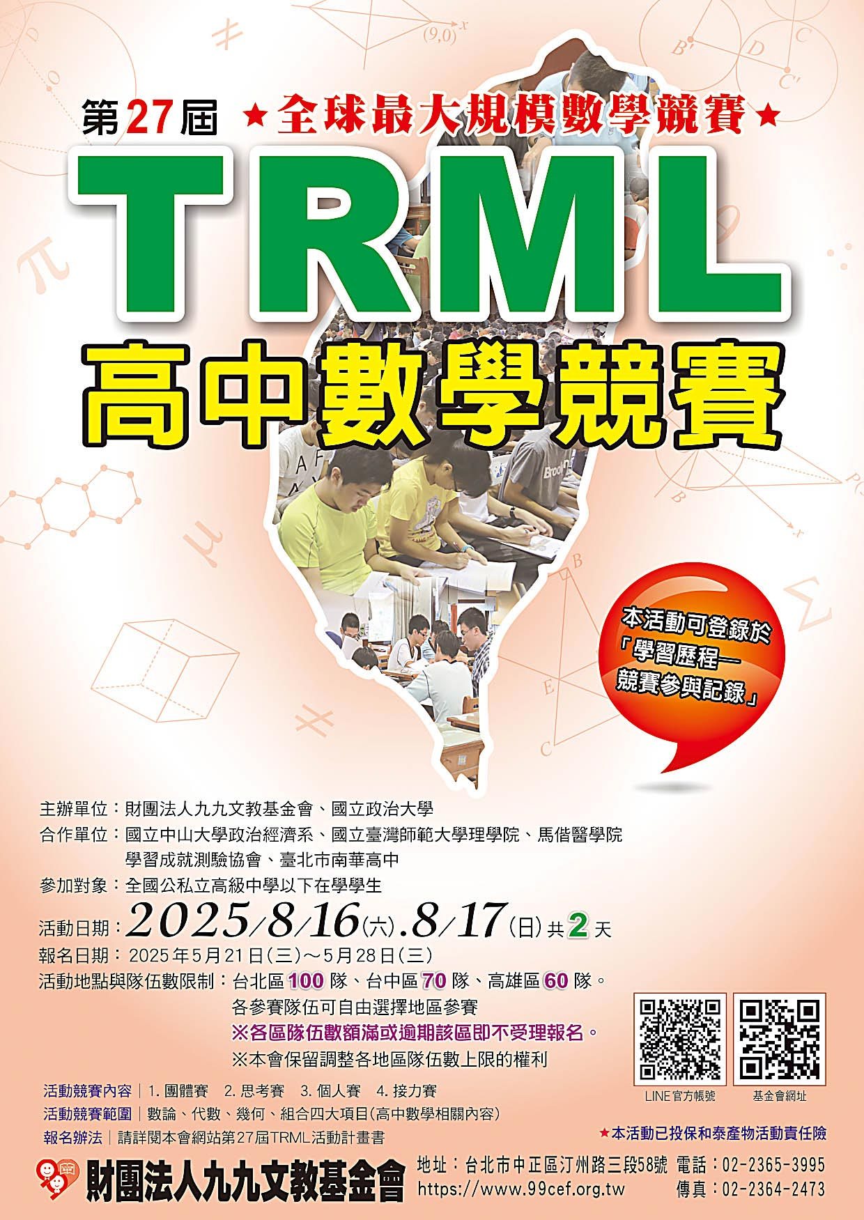 五、活動地點:將於台北、台中、高雄三區舉行,各參賽隊伍可自由選擇參賽地點,惟參賽地點選定後,恕不接受更改。另因場地限制,各地區參賽隊伍數額滿後, TRML 線上報名系統該區即不再受理報名,但本會保留調整各地區隊伍數上限的權限,敬請有意參賽之同學,儘快完成報名手續。