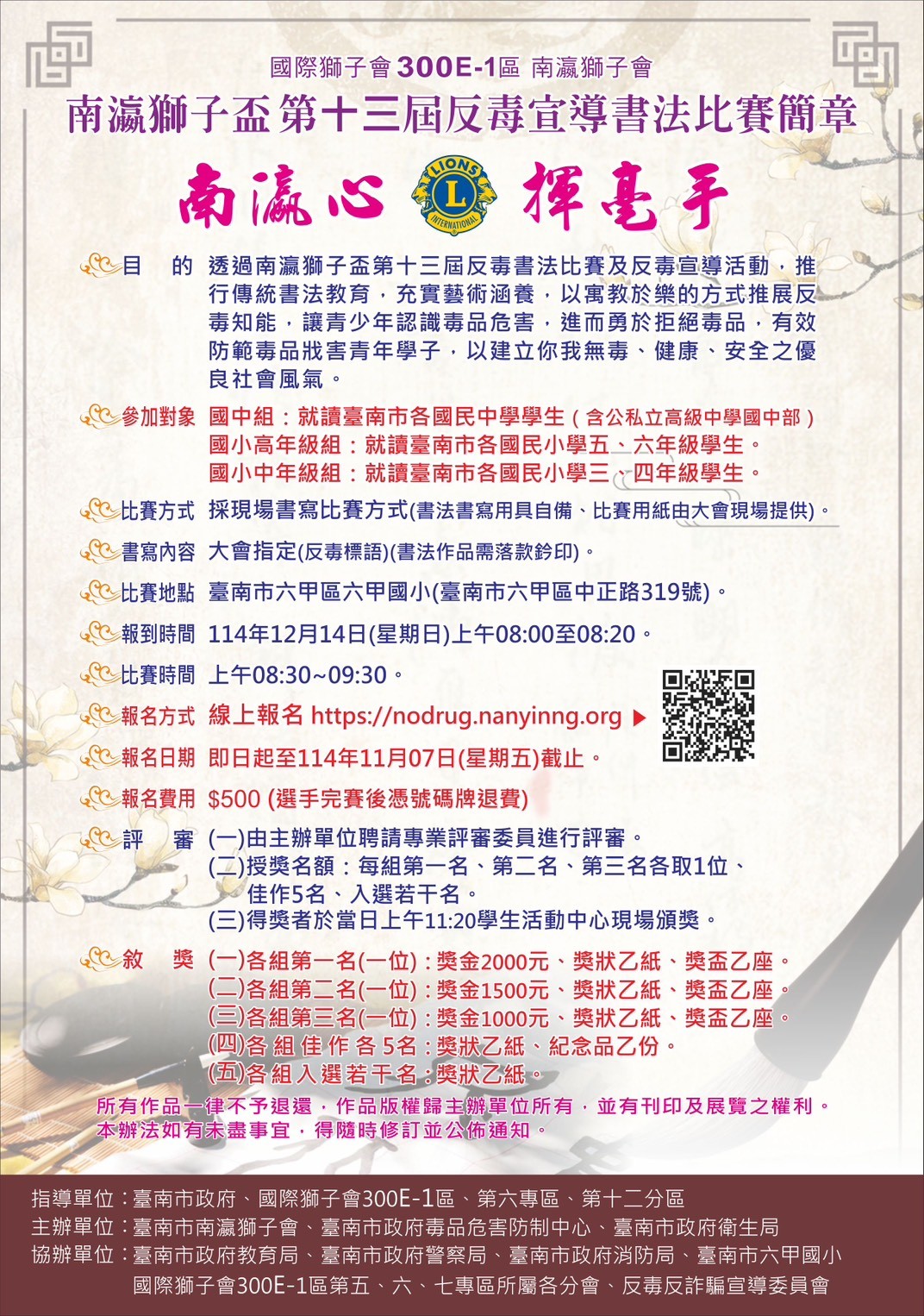 五、報名日期:即日起至 114 年 11 月 7 日(星期五)上午 12 時止,報名網址: https://nodrug.nanyinng.org/ 。