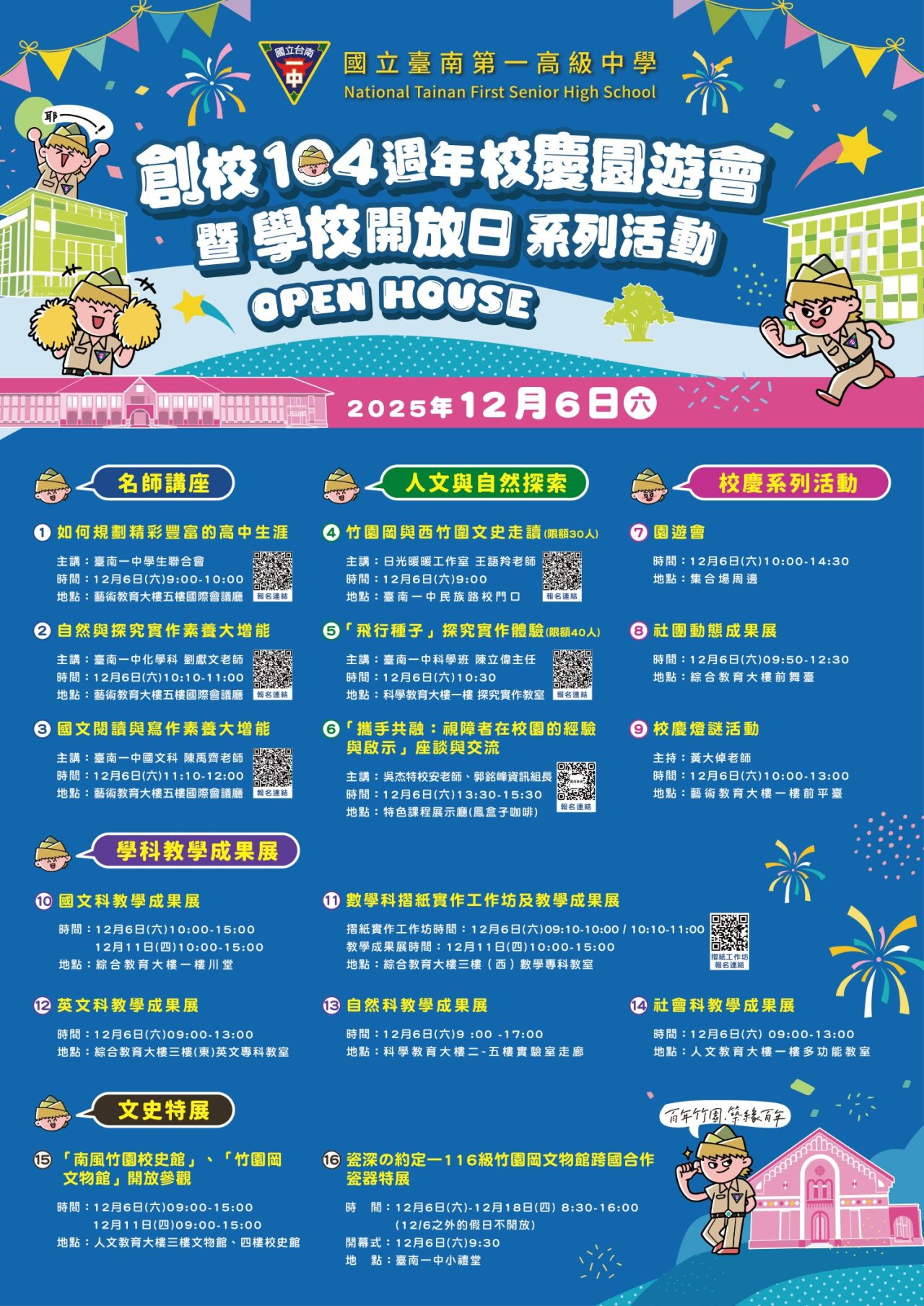 一、本校迎接創校 104 週年校慶,今年首度推出「學校開放日 OPEN HOUSE」系列活動,從名師講座、人文與自然探索、學科成果展到文史特展,再到創意十足的園遊會與社團展演,誠摯邀請貴校師生、家長共襄盛舉。