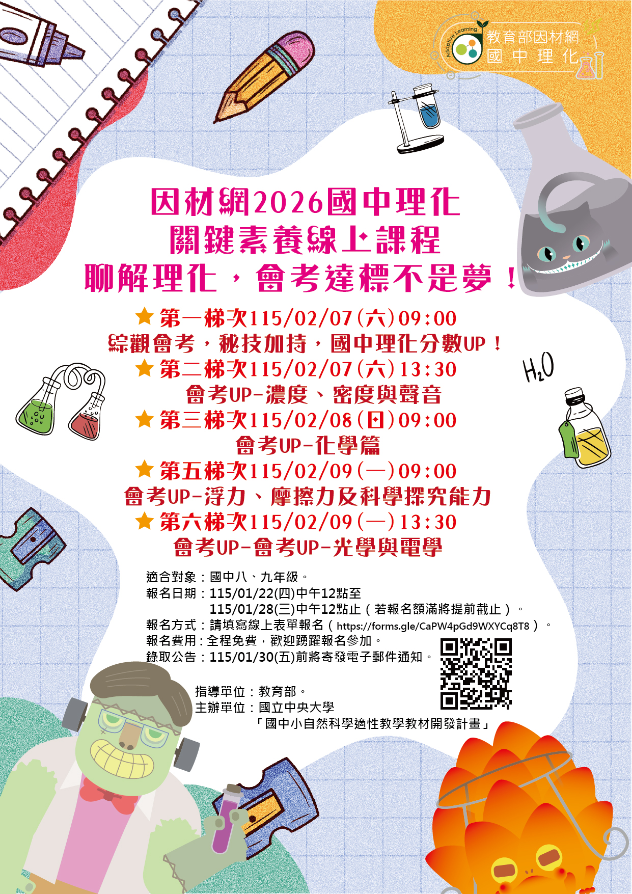 1、第一梯次為 115/02/07(六)綜觀會考,秘技加持,國中理化分數 UP!。