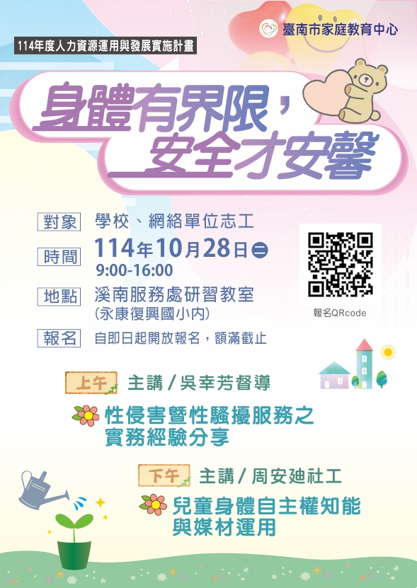 114年10月28日(星期二)辦理「114年度人力資源運用與發展實施計畫-身體有界限,安全才安馨」,鼓勵學校老師或志工團員們踴躍參加。