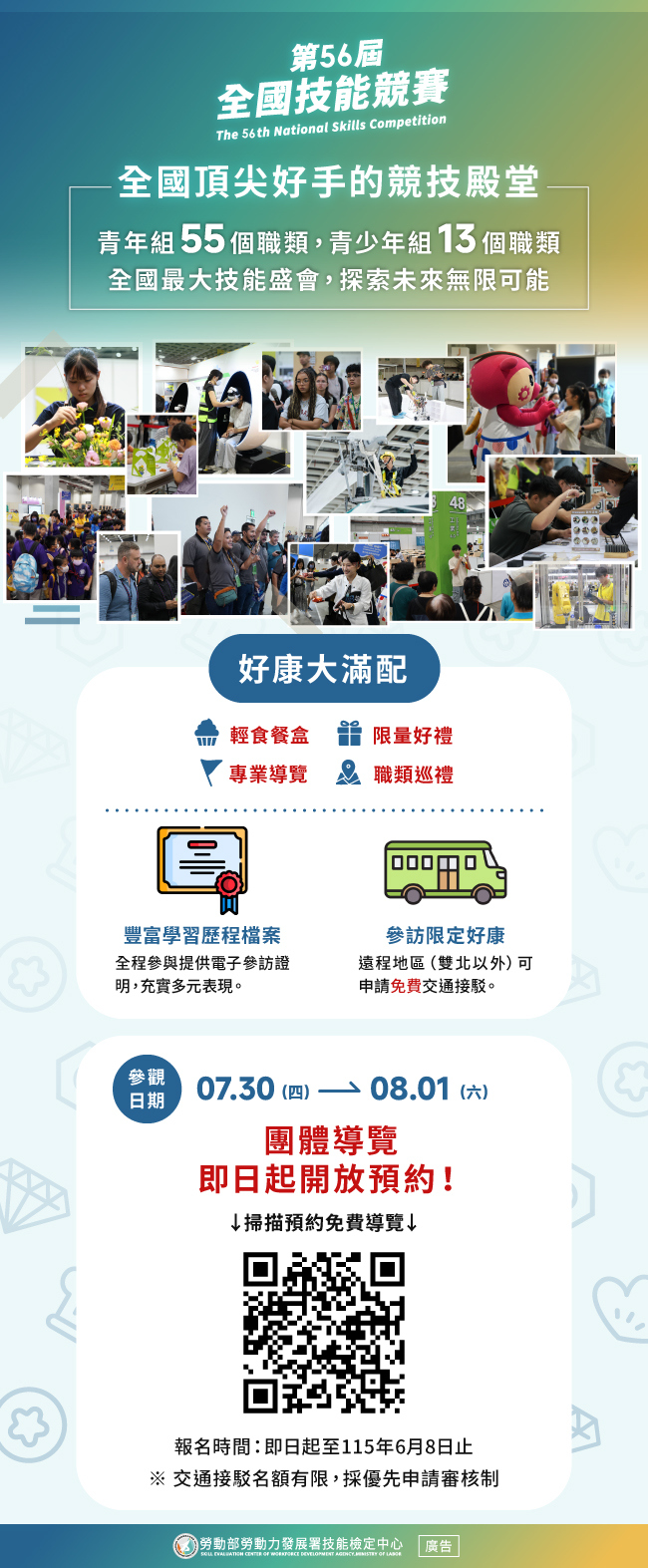 三、活動內容:本次辦理青年組55職類與青少年組13職類,共計68職類,為職業訓練與技職教育之年度盛事,歡迎各級學校師生踴躍參訪。