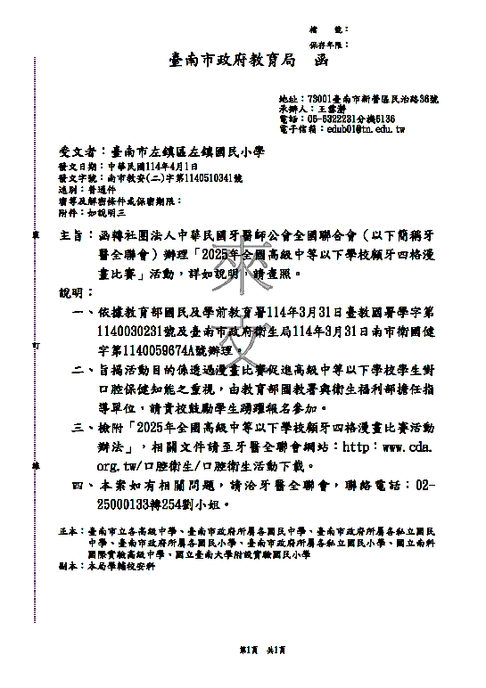 一、檢附「2025 年全國高級中等以下學校顧牙四格漫畫比賽活動辦法」,相關文件請至牙醫全聯會網站: http : http://www.cda.org.tw/口腔衛生/口腔衛生活動下載。