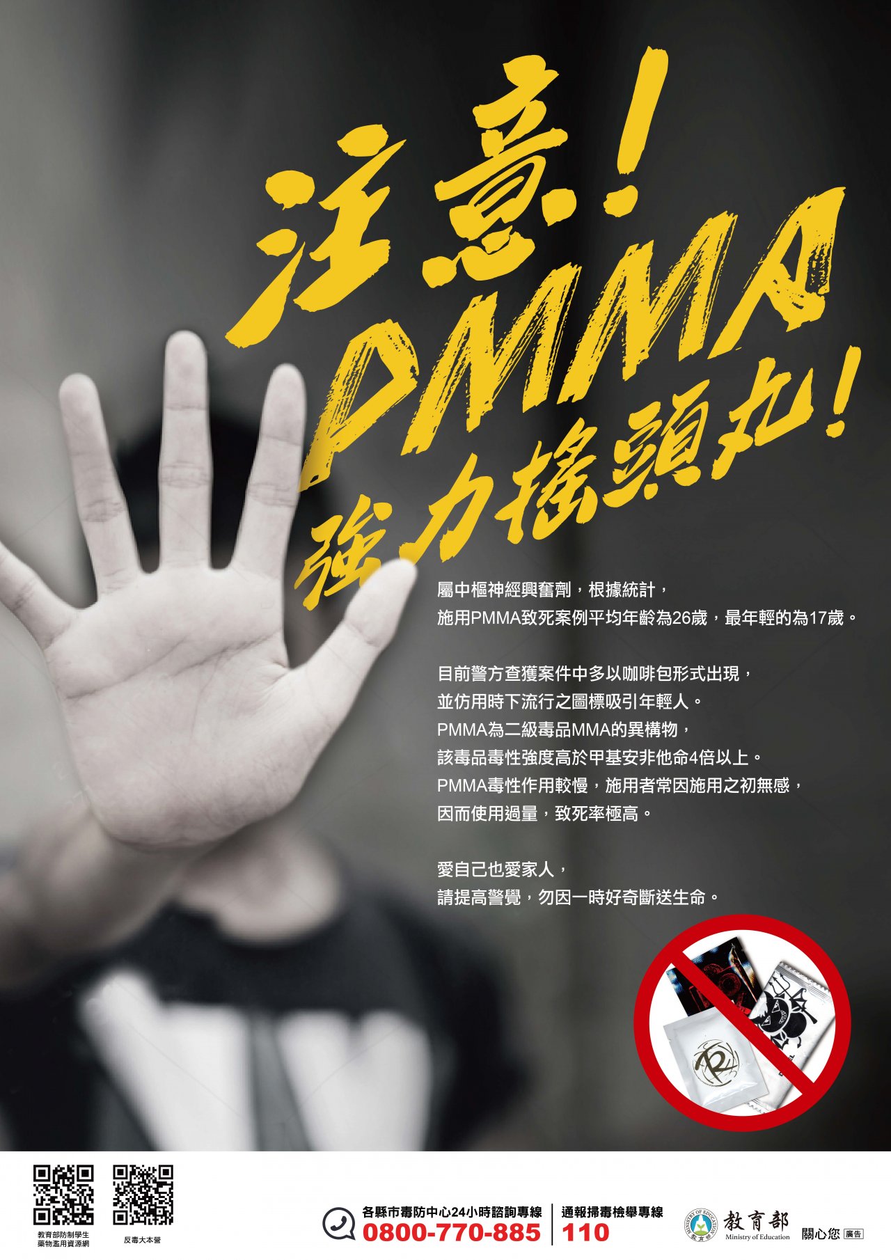 (一) 高檢署統計, 108 年施用含有強力搖頭丸因而死亡之案例高達 34 件;為宣導青少年及民眾提高對「PMMA」之警覺性,教育部制作文宣海報 1 款,協助