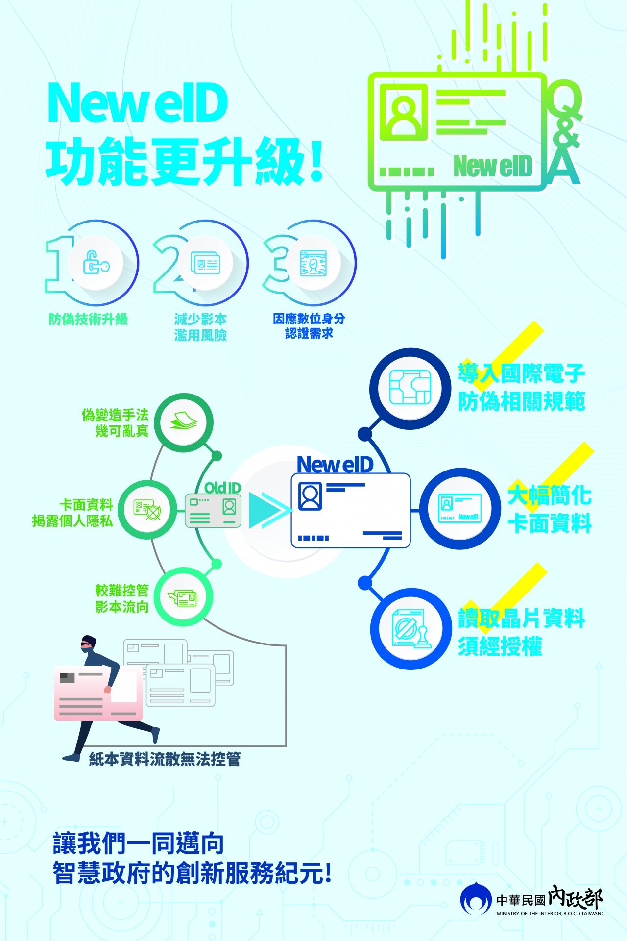 二、為深化外界對新式數位身分識別證(New eID)規劃情形之瞭解及持續化解民眾疑慮,爰提供 4 款海報(如附件)電子檔,惠請貴機關(單位)及所屬多加運用於適當處所張貼宣導民眾周知,並協助透過網站、視訊牆、電子看板、跑馬燈或臉書等多元方式,加強宣導旨揭全面換證事宜,文宣內容如下:
