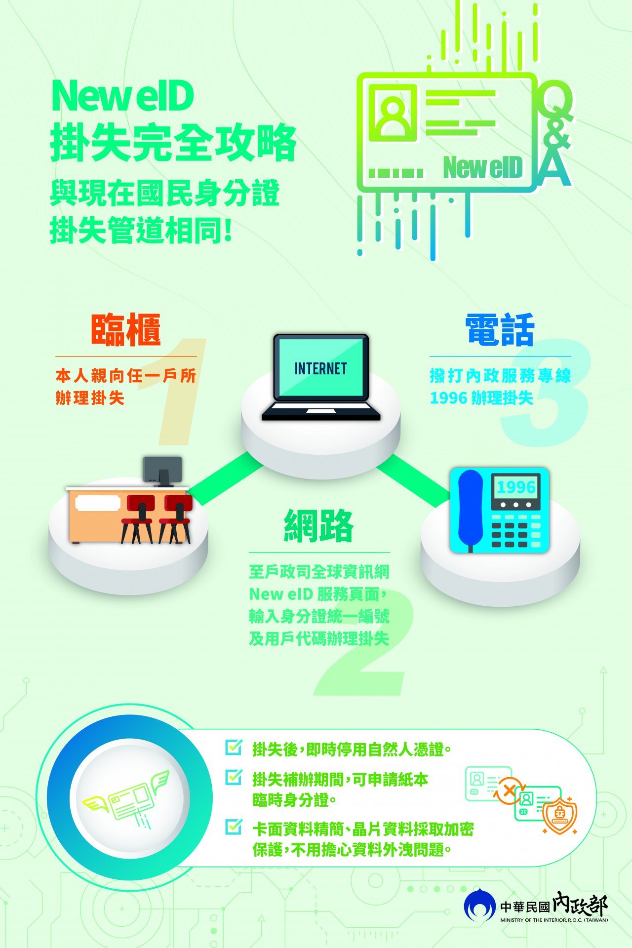 (二)「數位身分識別證( New eID )卡面僅有個人基本資料,配偶、父、母等資料於晶片內加密保護,證件遺失,立即掛失,個資保護即時又安全」。