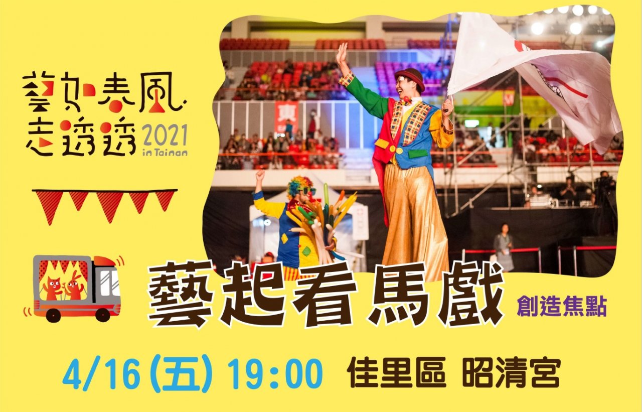 一、依據臺南市政府文化局 110 年 1 月 18 日南市文永字第 1100170938 號函辦理。 二、活動訊息 (一)演出單位:創造焦點。 (二)演出節目:藝起看馬戲。 (三)演出時間: 110 年 4 月 16 日晚上 7 點。 (四)演出地點:佳里區 昭清宮前廣場(地址:臺南市佳里區新生路 120 號),雨備場地:六里聯合活動中心。