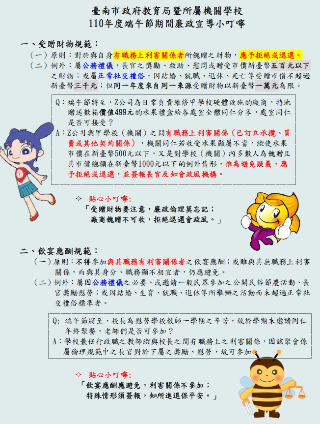 二、為貫徹本府「清廉效率、公開透明」之施政理念,凝聚廉潔共識,爰規劃辦理本局暨所屬機關學校「110年度端午節期間廉政宣導」,期使同仁明瞭遇有受贈財物、飲宴應酬及請託關說等廉政倫理事件應行注意事項,避免誤觸法網。