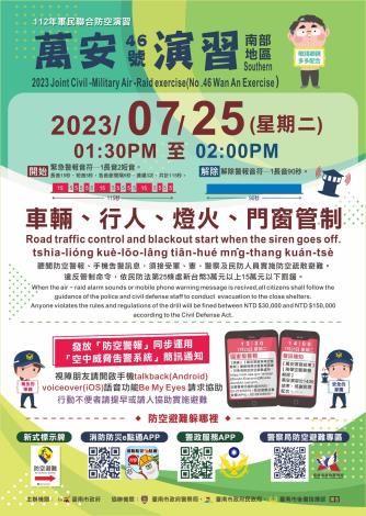 本次演習將於 7 月 25 日(星期二)下午 1 時 30 分至 2 時實施,惟為強化各項防空整備與作為,本次防空警報解除後將由社會局主政辦理 30 分鐘戰災搶救(災害救援)及戰時災民收容救濟站開設演練,相關時間略述如下: