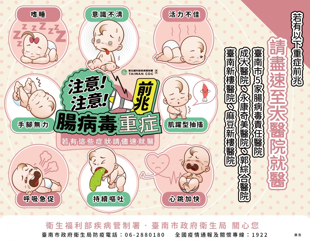 (一)注意腸病毒重症警訊!若您的孩子出現嗜睡、意識不清活力不佳、肌躍型抽搐、手腳無力、呼吸急促、持續嘔吐、心跳加快等重症前兆,請儘速前往大醫院就醫!腸病毒可能引發嚴重併發症,務必提高警覺。臺南市 5 家腸病毒責任醫院:成大醫院、永康奇美醫院、郭綜合醫院、臺南新樓醫院、麻豆新樓醫院。預防勝於治療,勤洗手、避免接觸病童,共同守護孩子健康!