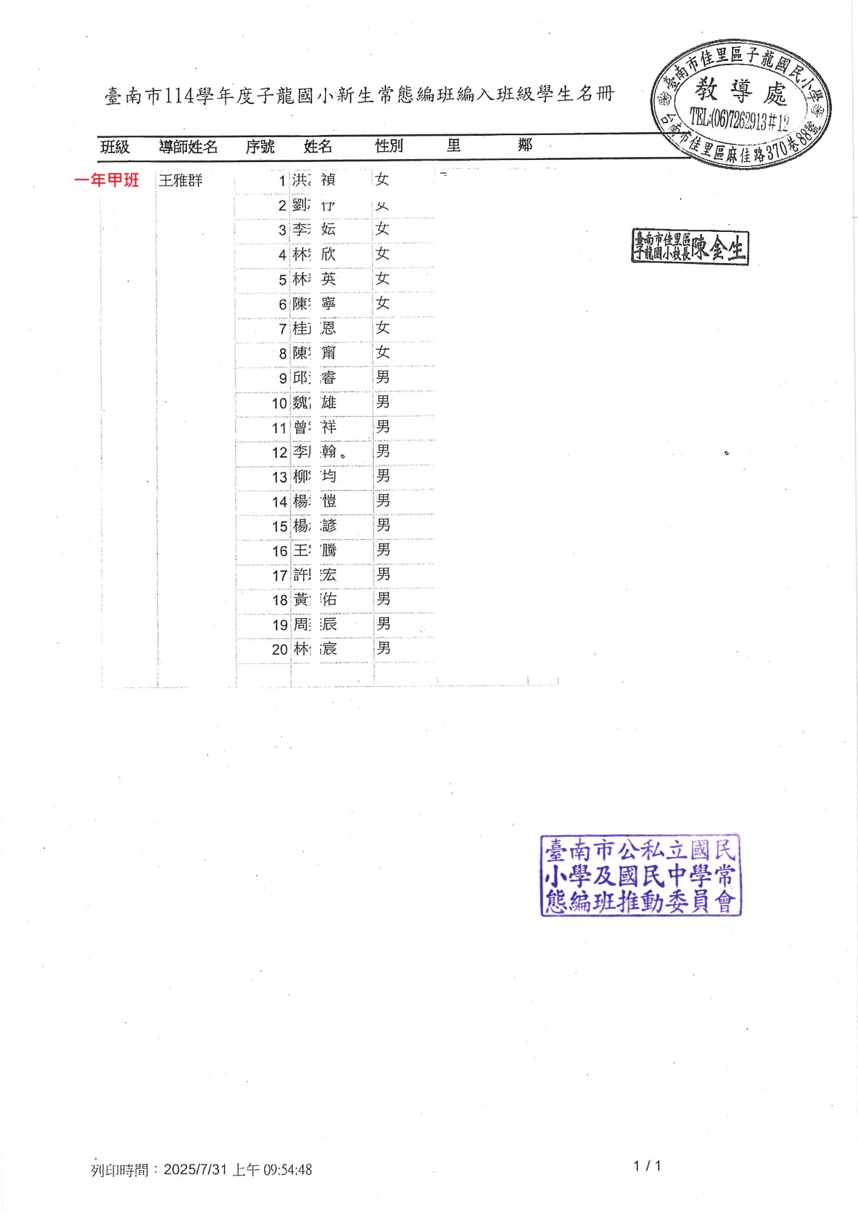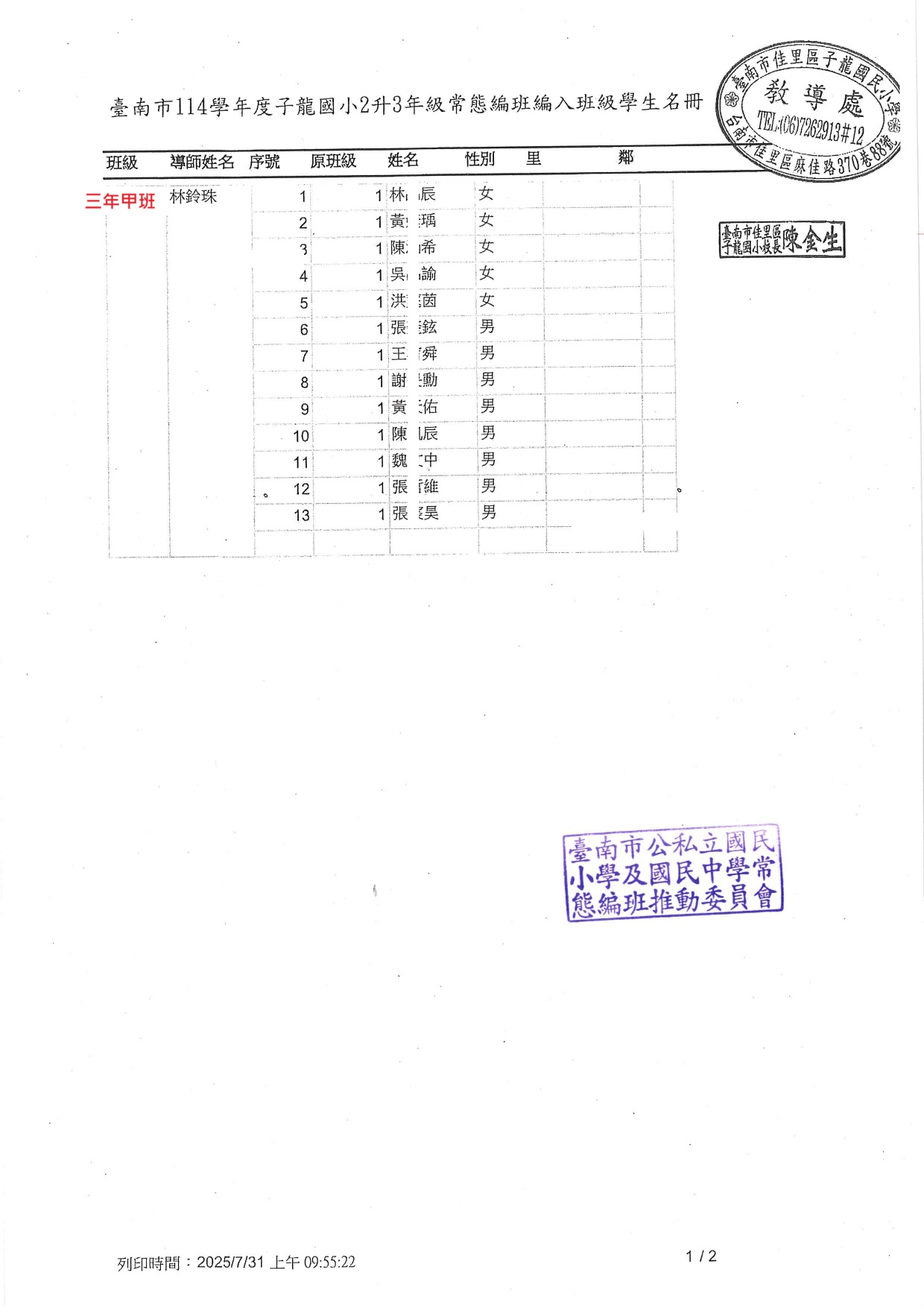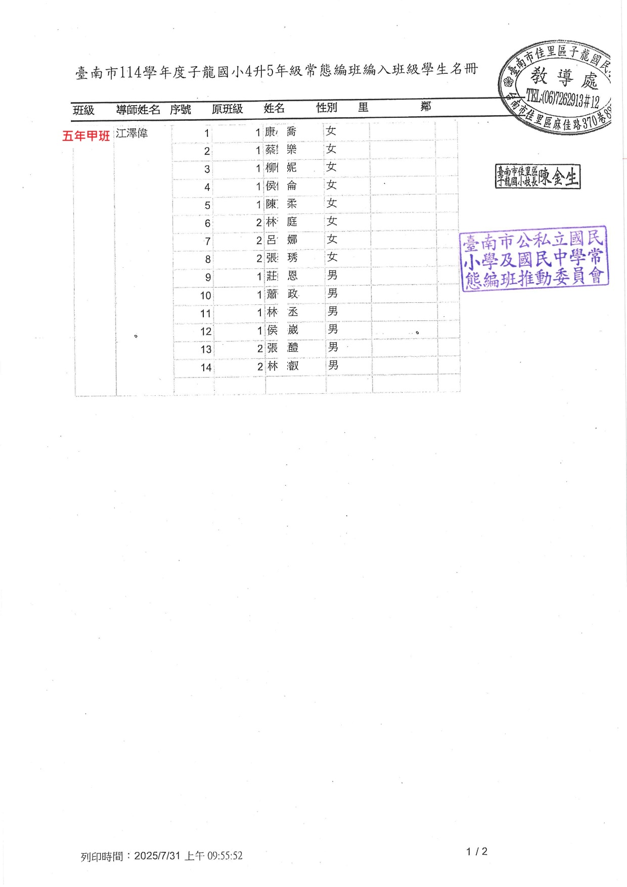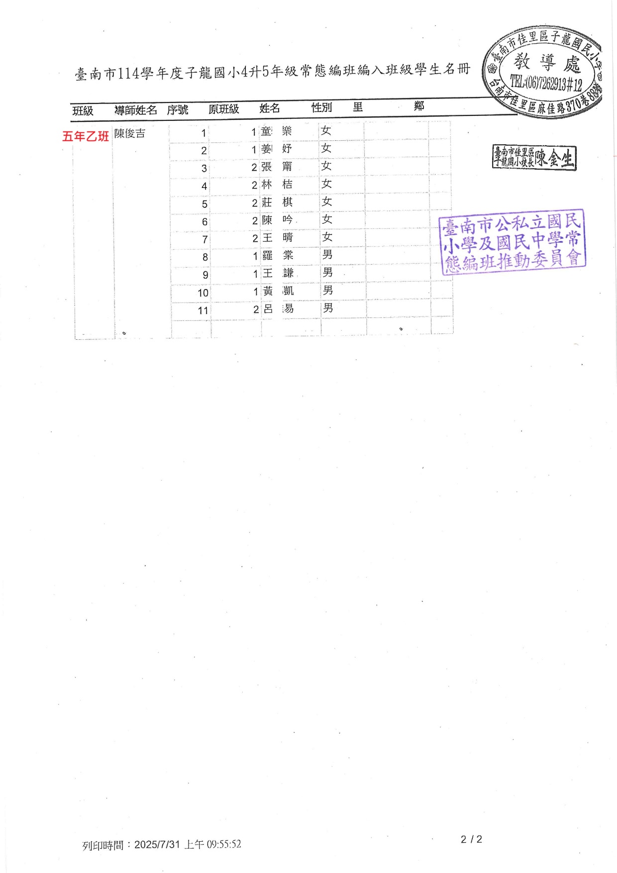 114 學年度子龍國小編班名冊出爐囉~