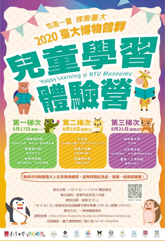二、「悠遊一夏 探索臺大: 2020 臺大博物館群兒童學習體驗營」相關資訊如下: