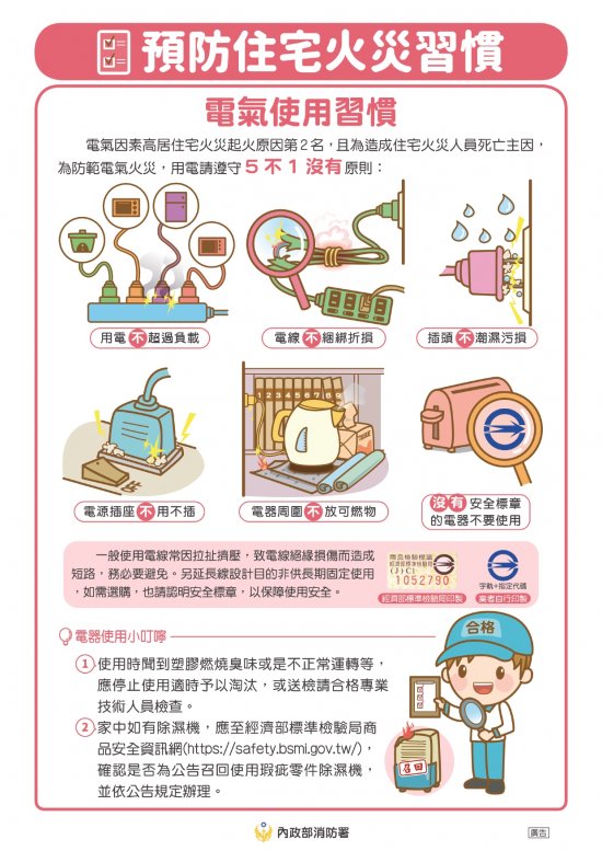 (一)請利用集會或朝會時間,協助宣導平時應注意用電安全,留意電線、插座及延長線有無電流過載情形,如發現配電線路老化或配電盤斷路器跳脫等異常情形,應請電器專業人員檢查,另亦請協助宣導推廣設置住宅用火災警報器(簡稱「住警器」),加強居家安全保障,可及早偵知火災,發出警報聲響提醒儘快應變及逃生。