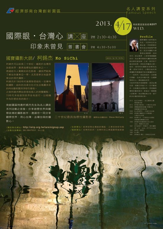 轉知經濟部南台灣創新園區與本府合辦「名人講堂:國寶攝影大師柯錫杰『國際眼‧台灣心』講座暨『印象未曾見』簽書會」,詳如附件請參閱。 一、本活動特邀請國寶攝影大師柯錫杰先生分享遊歷世界與觀察故鄉之攝影創作歷程,相關事項如下: (一)日期及時間:102年4月17日(星期三)14時30分至17時。 (二)辦理地點:南台灣創新園區服務館S207 (台南市安南區工業二路31號)。 (三)報名網址:http://airp.org.tw/iars/signup.asp。 二、全程參與本活動者,核予2小時公務人員終身學習時數。 三、本活動聯絡人:林小姐,電話:06-3847031。 四、本項研習活動係自由參加,教師課務自理。