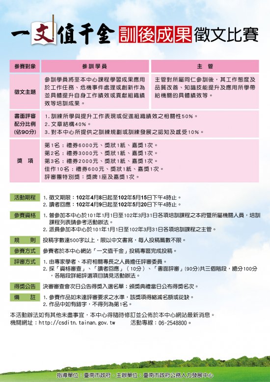為活絡公務人力對培育業務參與度,市府公務人力發展中心訂於102年4月8日至102年5月15日止舉辦「一文值千金」訓後成果徵文比賽活動,歡迎同仁踴躍參加,詳如附件請參閱。