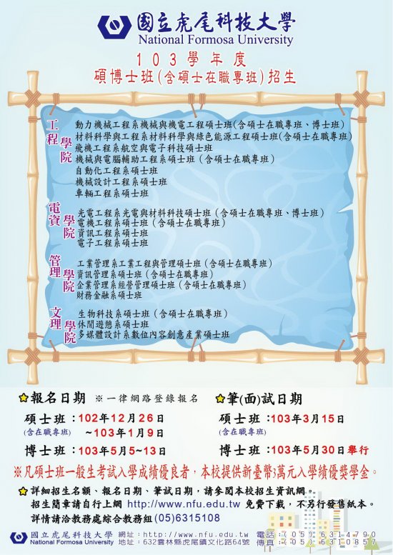 轉知國立虎尾科技大學103學年度碩士班、碩士在職專班及博士班考試入學招生訊息,詳如附件請參閱。 一、本校設有四大學院,招生系所包含工程、機械、車輛、飛機、電機電子、資訊、管理、生物科技、休閒遊憩及多媒體設計等領域,多有開設在職進修課程並提供進修機會,歡迎踴躍報名。 二、本年度招生一律採以網路報名方式,相關時程如下: (一)報名日期:碩士班(含碩士在職專班)為102年12月26日至103年1月9日止;博士班為103年5月5日至13日止。 (二)筆(面)試日期:碩士班(含碩士在職專班)為103年3月15日(星期六);博士班為103年5月30日(星期五)。 三、該校碩士在職專班招生入學一律免筆試,皆採書面資料審查與面試方式評分,檢附103學年度碩博士班考試入學招生資料乙份,其它報名相關事項,請參閱招生簡章(本校網址:http://http://www.nfu.edu.tw/),並請自行下載利用。服務專線:(05)6314790。 備註:本校同仁欲報考碩士班,請事先專簽申請在職進修案。