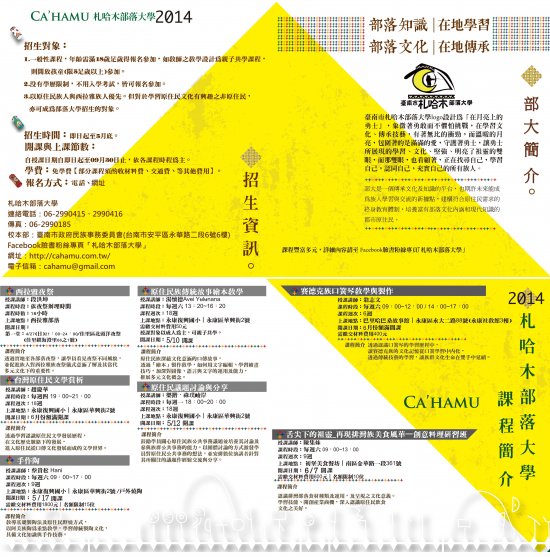 檢附「札哈木部落大學2014年招生訊息」、報名簡章及「NIAMEN藝文講座」宣傳海報電子檔各乙份,相關報名資訊及活動內容請見「札哈木部落大學」Facebook臉書粉絲專頁(網址:https://www.facebook.com/tn.cahamu?fref=tshttp://cahamu.com.tw/)或札哈木部落大學官網(http://cahamu.com.tw/)。