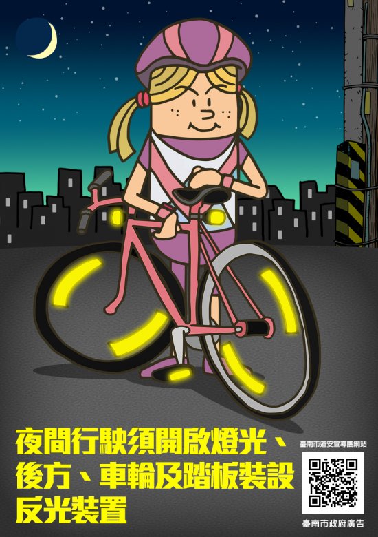 本次宣導主題:「自行車車身、車輪請裝設反光配備;夜間請開啟燈光,前途一片光明,臺南市政府關心您。」