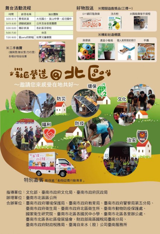 北區區公所辦理「2018 年社區營造@北區」活動暨「2018 年藝術進區」活動,訂於 107 年 10 月 27 日(星期六) 15 時至 19 時 30 分假開元振興公園(長榮路及開元路交叉口)舉行,敬邀蒞臨指導並請協助宣傳。