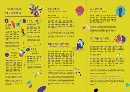 (三)展覽內容:展示兒童權利從忽視到關注的推動過程,從波蘭的兒童權利之父─柯札克為起點,認識兒童人權的核心精神與內容,並從國際間的兒童權利演進歷程,反思臺灣過去歷史上,許多未滿 18 歲的兒少們遭受人權迫害的狀況,喚起大眾對於兒童人權的重視。並藉由看見兒童力的國內外案例,深刻認識兒童不僅是受保護對象,更是權利主體,具有參與社會的積極性角色。以嶄新的多媒體互動展示手法,並且特別邀請 16 位插畫家繪製兒童權利插畫,讓觀展者從平易近人的語彙及參與式的觀展體驗中,深刻思考兒童權利的重要性與價值。