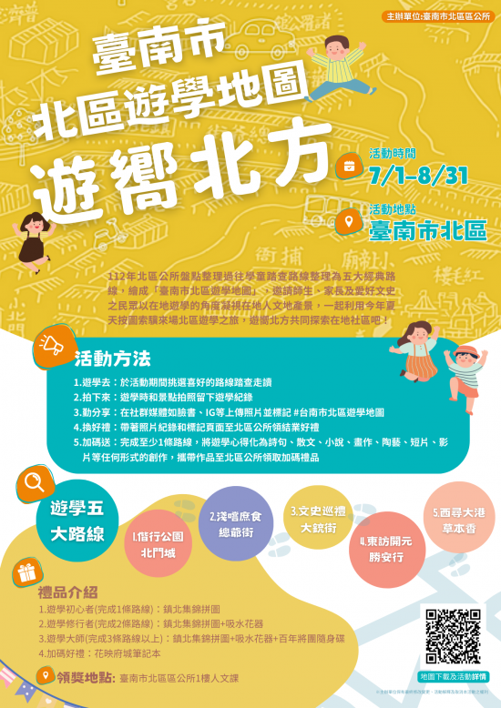 辦理「學童踏查」計畫,邀請北區師生以在地遊學的角度凝視在地人文地產景,透過社區走讀、踏查、學習、紀錄、討論的過程,了解在地社區的特性、文化資產及在地內涵,累積學生公民素養及社區意識。承蒙各校多年響應, 112 年北區公所盤點過往各校踏查路線整理為五大經典路線,繪成「臺南市北區遊學地圖」,訂於 7 月 1 日至 8 月 31 日辦理旨揭活動,供師生、家長及愛好文史之民眾利用今年夏天按圖索驥來場北區遊學之旅,共同探索在地社區。