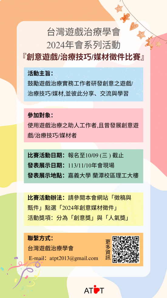 主旨:本會將於 113 年 11 月 10 日舉辦 2024 台灣遊戲治療學會年會暨「性創傷-遊戲評估、介入與療癒」學術研討會/專業工作坊,相關系列徵選活動已延長徵件日期。詳情如說明及附件,敬請貴單位協助張貼宣傳與鼓勵貴單位相關人員參加。
