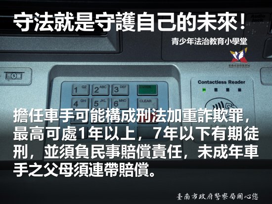 本府警察局「青少年犯罪預防宣導圖卡」4 則,詳如說明,請協助運用各項活動時機適時宣導,以強化青少年法治觀念,避免觸法。