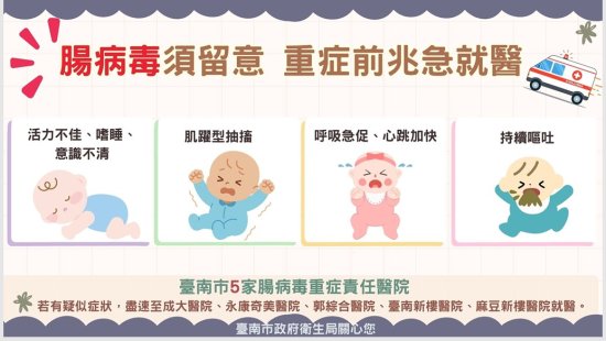 (一)注意腸病毒重症警訊!若孩子出現嗜睡、意識不清活力不佳、肌躍型抽搐、手腳無力、呼吸急促、持續嘔吐、心跳加快等重症前兆,請儘速前往醫院就醫!腸病毒可能引發嚴重併發症,務必提高警覺。南市 5 家腸病毒責任醫院:成大醫院、永康奇美醫院、郭綜合醫院、臺南新樓醫院、麻豆新樓醫院。預防勝於治療,勤洗手、避免接觸病童,共同守護孩子健康!