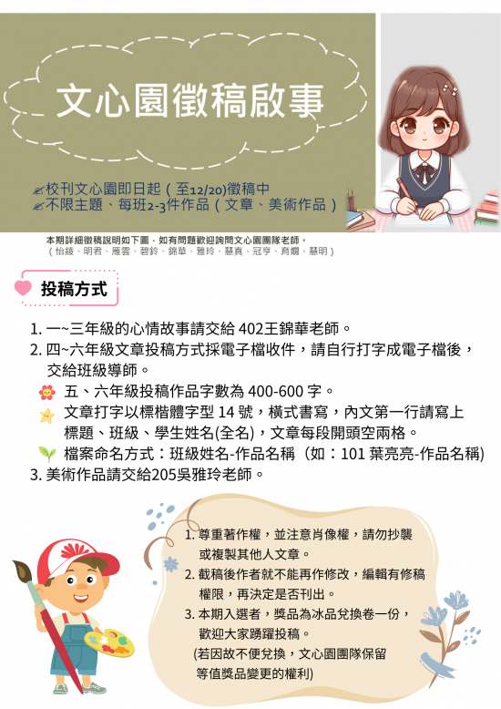 1. 各年級徵稿不限主題,徵稿內容包含文章作品與美術作品 (一~三年級以心情故事、短文創作為主,請書寫於投稿專用紙;四~六年級以文章作品為主。)