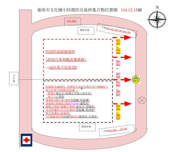 師長引導疏散至操場【集合地點在空曠場所,不需再用物品護頭】,並完成人員清查(使用紅表綠表)及安全回報動作→