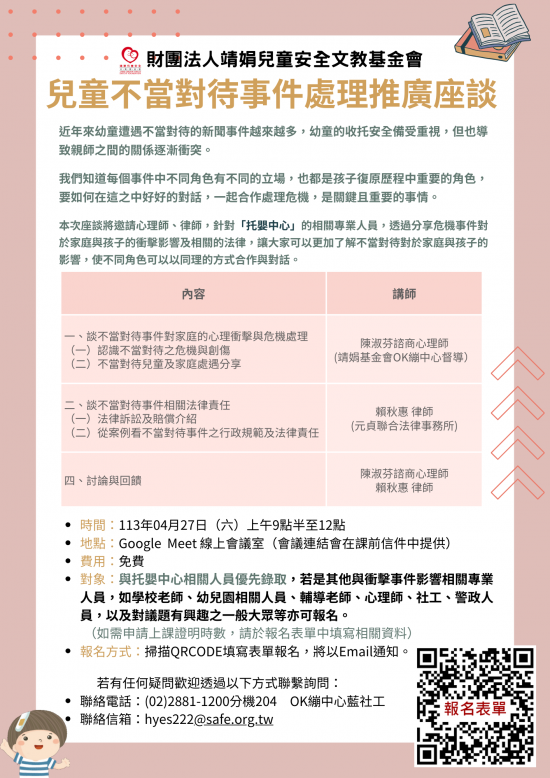 三、檢附「兒童不當對待事件處理推廣座談」單張 1 份。