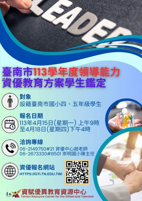 (二)國小領導能力資優教育方案學生鑑定安置:報名自 113 年 4 月 15 日(星期一)上午 9 時起至 4 月 18 日(星期四)下午 4 時止,鑑定日期為 113 年 5 月 19 日(星期日)。