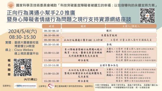 (三)邀請對象:各級普特輔學校教師、教師助理員、教保員、生輔員、居服員、照服員、社工、醫師、護理師、臨床心理師、職能治療師、物理治療師、語言治療師等支持情緒行為需求和(或) 輔助溝通需求的專業人