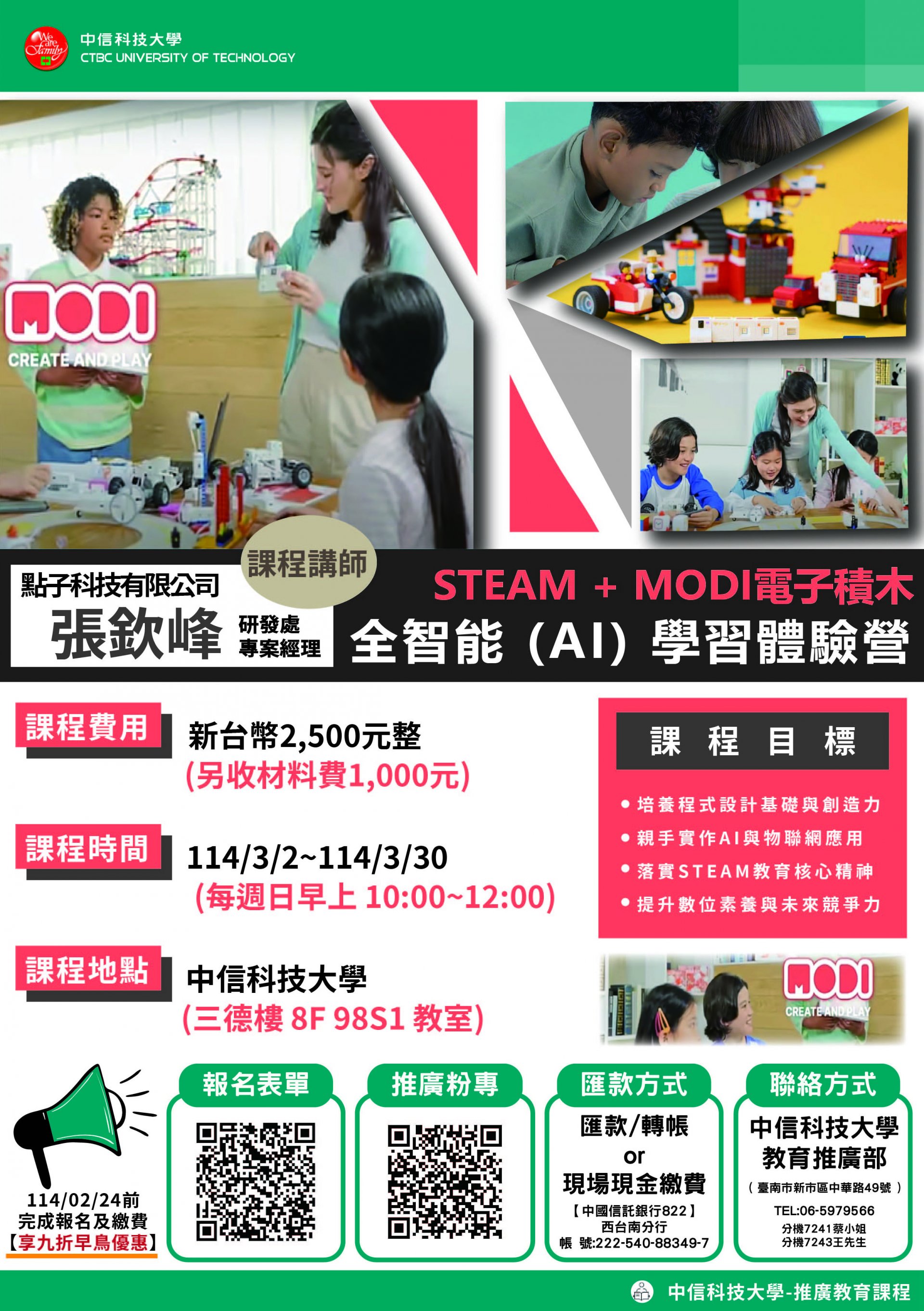 四、報名方式:請至中信科技大學推廣教育部網站填寫報名表(https://ext.ctbctech.edu.tw/p/406-1009-11800,r23.php?Lang=zh-tw)、掃描招生文宣QR碼或聯絡教育推廣部辦公室。