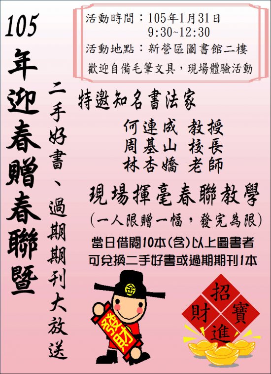 主旨:新營區公所圖書館訂於105年1月31日(星期日)上午9時30分假圖書館2樓大廳辦理105年迎春贈春聯暨二手好書/過期期刊大放送活動,惠請協助宣傳民眾週知,並鼓勵民眾踴躍參加,相關內容詳如說明,請查照。