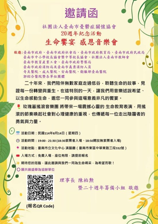 一、依據財團法人臺南市憂鬱症關懷協會(下稱憂協)20週年紀念活動─生命饗宴 感恩音樂會邀請函。