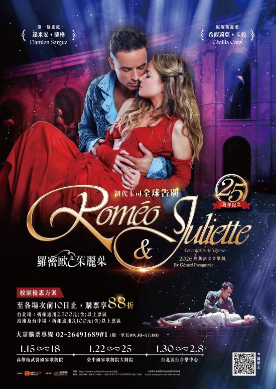 一、經典法文音樂劇《羅密歐與茱麗葉》自2001年在巴黎首演即轟動全球,以磅礴動人的音樂、現代感十足的編舞與都市巴洛克風格美學,重新詮釋莎士比亞經典悲劇,劇中更以紅與藍兩大色系象徵家族對峙,展現強烈視覺張力;而初代卡司的演出早已成為大眾心中難以取代的記憶,本次