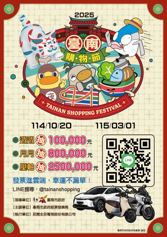 2025年臺南購物節活動持續到明年3月1日,只要在臺南消費不限金額登錄,消費滿50元就可獲得抽獎序號,獎項包括百萬電動車、3C實用家電、飯店住宿券等好禮,現金獎更是全面升級,月月抽8萬元,壓軸再抽現金88萬元!12月起更加碼推出「週週抽」,每週二抽出智慧電車與現金獎等總價值逾10萬元的獎項,驚喜連連。立即加入「2025臺南購物節」官方LINE 帳號,輕鬆完成消費登錄,來臺南旅遊GO購,買越多、抽越多,好禮大獎等你帶回家!