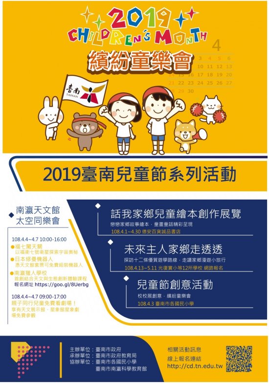 說明: 一、為歡慶兒童節慶,本局特規劃「話我家鄉兒童繪本創作展覽」、「未來主人家鄉走透透」、「兒童節創意活動」等活動,邀請本市兒童與家長一同歡慶。