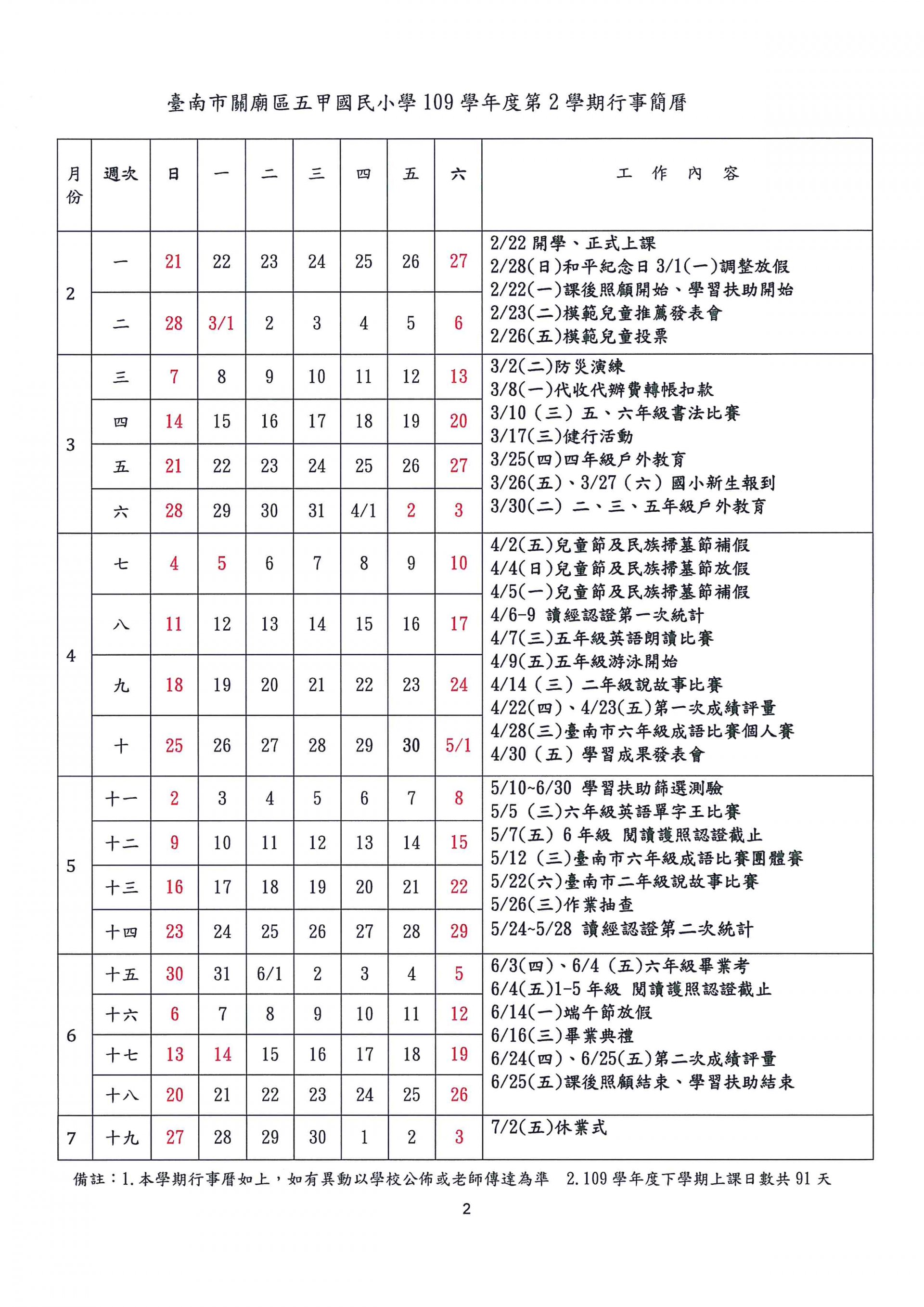 109 學年度五甲國小行事簡曆,若因相關因素影響,本校保有最後修正權利,僅供大家參考使用。