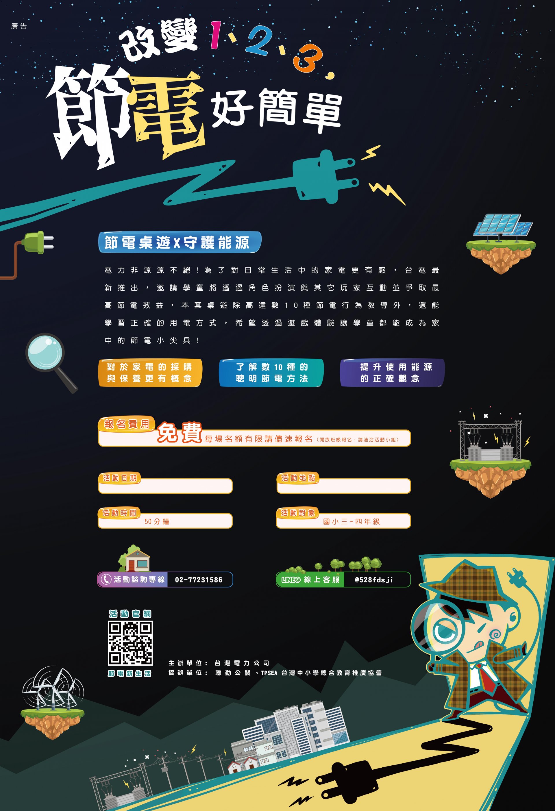 - 旨案為提升全民節電意識,並使節電教育能向下扎根,該公司辦理主題為「改變 123,節電好簡單」宣導活動,以淺顯易懂之教案遊戲引導學童了解節能知識,宣導節電能源教育。