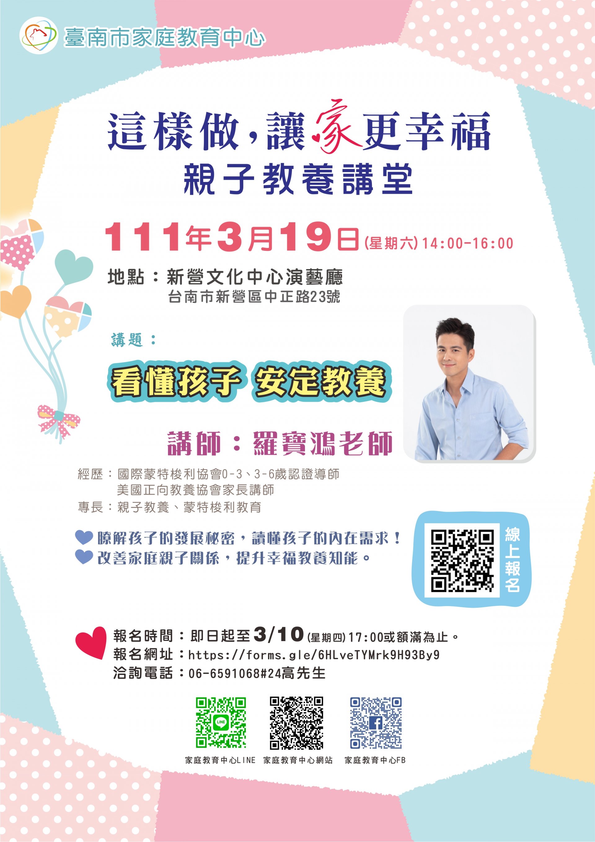 臺南市家庭教育中心邀請美國正向教養協會講師羅寶鴻老師,於本(111)年 3月 19日(星期六)下午 2 時至 4 時假新營文化中心演藝廳,邀您一起來「看懂孩子,安定教養」,希望透過名人現身說法,讓年輕世代藉由標竿學習,重視家庭生活與孩子們共同成長。
